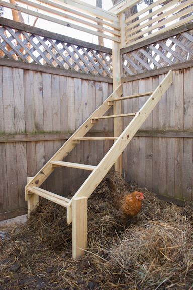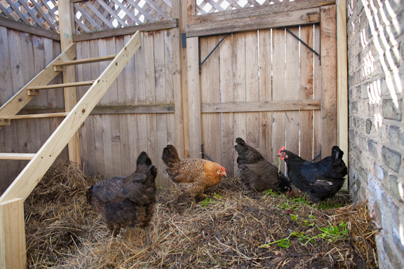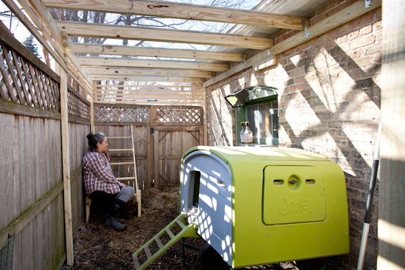 My backyard gardening buddy, Ellen, keeps chickens – Nugget, Dumpling, CoCo, and Pot Pie. They had been living in a small, plastic Eglu chicken coop. Functional, but frankly, their lives were not real high quality in there. Chickens love to have space to root around. They like a roost to sit up high on. And they love sunlight and fresh air. It occurred to Ellen she could vastly improve their quality of life, and have room for a couple more, if we could open up the coop and surround it with fencing and a wire roof. She has the perfect space next to her garage for such a chicken run, but how would she get that built?