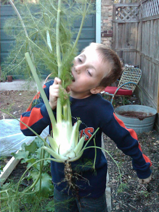 I can only speak for myself, but it turns out I had two little visitors in our March 3 garden this past weekend.  They’re good friends of mine – they call me Uncle Grant – and in truth, they are pretty good eaters in general.  But of course there are things they haven’t tried or don’t think they like.  James for example had never tasted fennel and was pretty down on tomatoes.  Please pardon my cell-phone pictures, but I think they illustrate how I feel right now about kids in gardens.  James was willing to taste fennel and a black cherry tomato.  They may not be his new favorite food, but his horizons are expanding.  I’m not sure, but I think that’s what’s supposed to happen at schools.