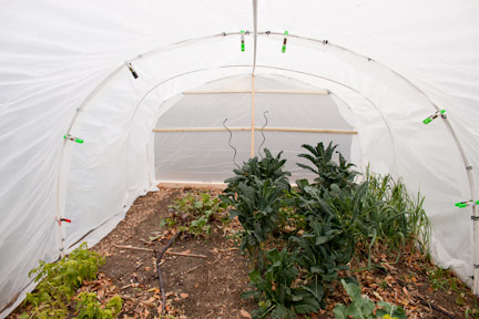 Here’s the north end in place.  The warmth inside was immediately apparent.  Note the ropes criss-crossing over the outside of the plastic.  This is my attempt to contain the plastic as it swells from wind.