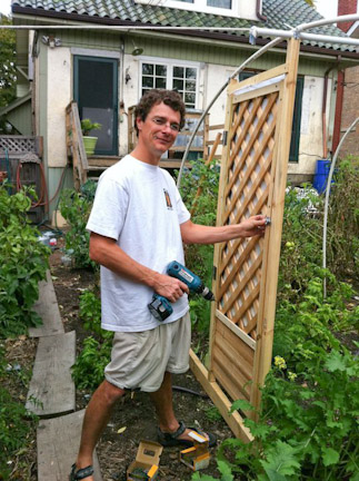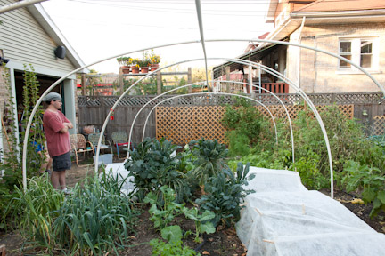 Here you see my friend Kirk surveying the work on Day One (read all about Day One here), which involved putting up the PVC structure.  Looks like a beached whale: