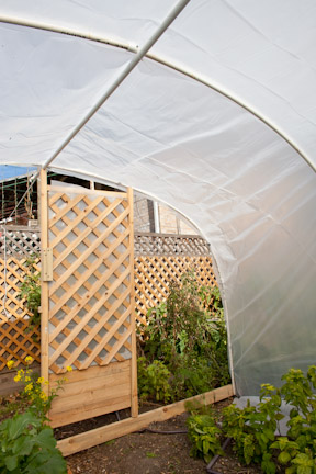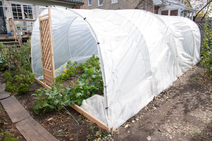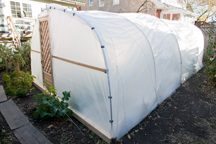 Regarding its construction, there was an extremely windy and cold Sunday when we had a serious breach in the cover. One end was blown completely open. Luckily the plastic had not ripped but had just pulled out of the little clips. I knew all along those were questionable. I kept resisting putting a screw into them to hold them in place because I was afraid of putting any holes in the plastic. I was afraid that would start a rip. That Sunday I had no choice. I got some little screws put into each of those clips and it’s held up wonderfully since then. Should have done that in the first place. Also needed more internal bracing that day, which I would just do from the start next year.