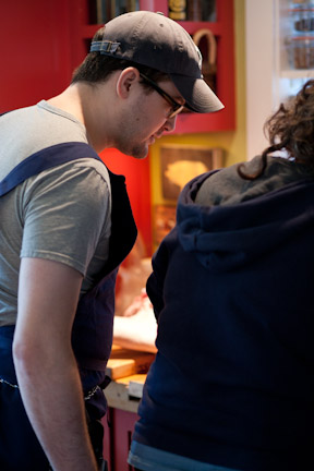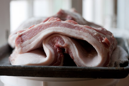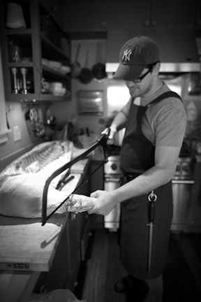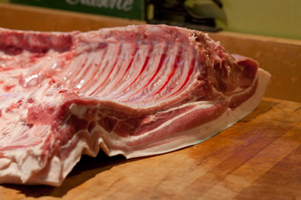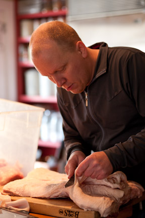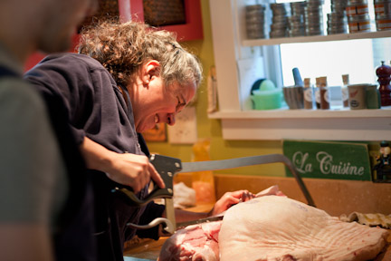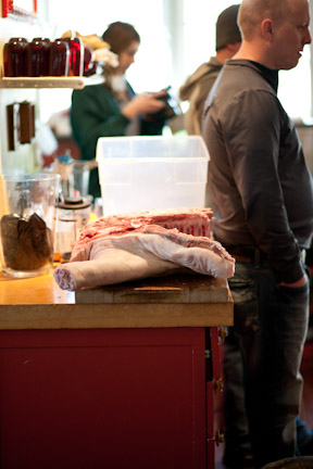 But ok, she had some serious professional help.  Rob Levitt formerly of the restaurant Mado has become so fascinated with breaking down whole animals that he is leaving the chef side of things and opening his own custom butcher shop, Butcher and Larder.  Chicago is hugely lucky to have him.  The contribution this sort of butchering will make to our food community is wonderful.  Rob (and other chefs doing snout to tail cooking) wants us all to think more carefully about where our meat comes from and what’s involved in getting a pork chop onto your plate.  Have you ever given any thought, for example, to the fact that a pig only has two tenderloins?  So what?  Well, for every “prime cut” like that you buy, you are effectively neglecting the rest of the animal.  To be a thoughtful carnivore, you need to be less wasteful and more appreciative of the other cuts.  After yesterday, I’m probably more jazzed about checking in with my local farmer for some leaf lard than I am for a tenderloin or pork chop.  I even know what to do with trotters now.