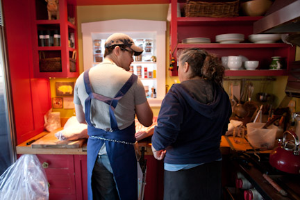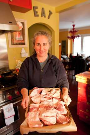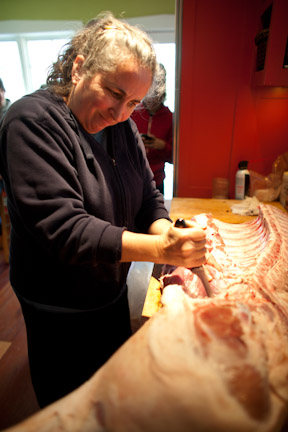 Yesterday, she butchered a two-hundred pound pig in her residential kitchen.