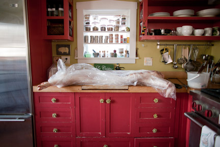 Get the kitchen string going and hang your beautiful work in the garage.  Or basement – I once hung a duck breast prosciutto on the handlebars of my wife’s bike in our basement storage.  Don’t tell her.
