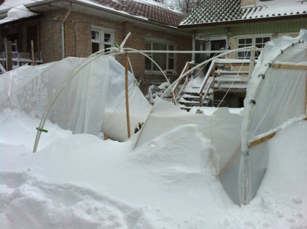 Last week’s blizzard was intense and poor Ellen was out at 3:00am dealing with our collapsing, flapping, noisy hoop house. When I saw her photos, I was relieved that the destruction was so total. If it had been marginal and I could see some way to rebuild, well, I’d have to be over there rebuilding. This looked so bad I was just mentally able to let it go. The best I could hope for was that there was now a two foot snow insulator on top of everything. Maybe that would be good for something.