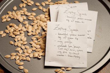 So late last fall we pulled a ginormous Zephyr and set it aside to dry. It turned a beautiful orange color, like a pumpkin, and hardened like one too. We started planting in February – it was high time to harvest and dry these seeds, so I cut it open last week, rinsed the seeds and spread them out to dry. Suddenly, there before me was a lot of seed, a lot of more or less organic hope. Something I could share. Something I could drop on a table at a seed swap.
